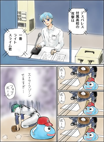 第3弾,「う,ウグイス嬢?」。 多分彼ならやれます。うん。 ちなみにストライクゾーンはだいたい,バッターの胸の辺りから膝まで。 このあたりから1P漫画っぽくなっていきます。まだまだ続きます。こちら。