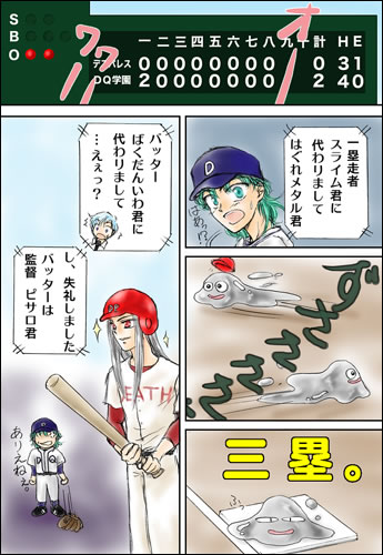 第7弾,「いきなり九回表ツーアウト」。 またまたフォアボールで塁に出たスライムに代わって,最強の俊足野郎が。 そしてウグイス嬢(坊)もびっくりのありえない代打です。 さぁ,ピンチです。ノイエはここを抑えきれるのか? そしてピー様はこの後も暴走してくれるのか!?(笑)こちらです。