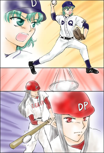 第8弾,「いざ勝負!!」。 一枚くらいはまともに投げてる&打ってる絵を入れてみました。 ひと昔前の野球漫画のノリで。楽しかったですv ここにきてようやくまともな顔のピサロ様登場(笑)。 ジャストミートしてるように見えますが,さあ,どうなるか。 次が最後の一枚です。勝負の行方は如何に。こちらへ!